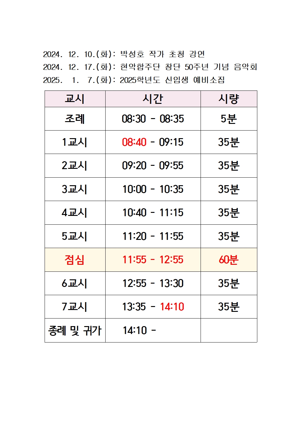 특히, 12. 10.(화)에는 점심 식사 후에 박성호 작가 초청 강연으로 인해 3시 30분 이후에 하교합니다.
