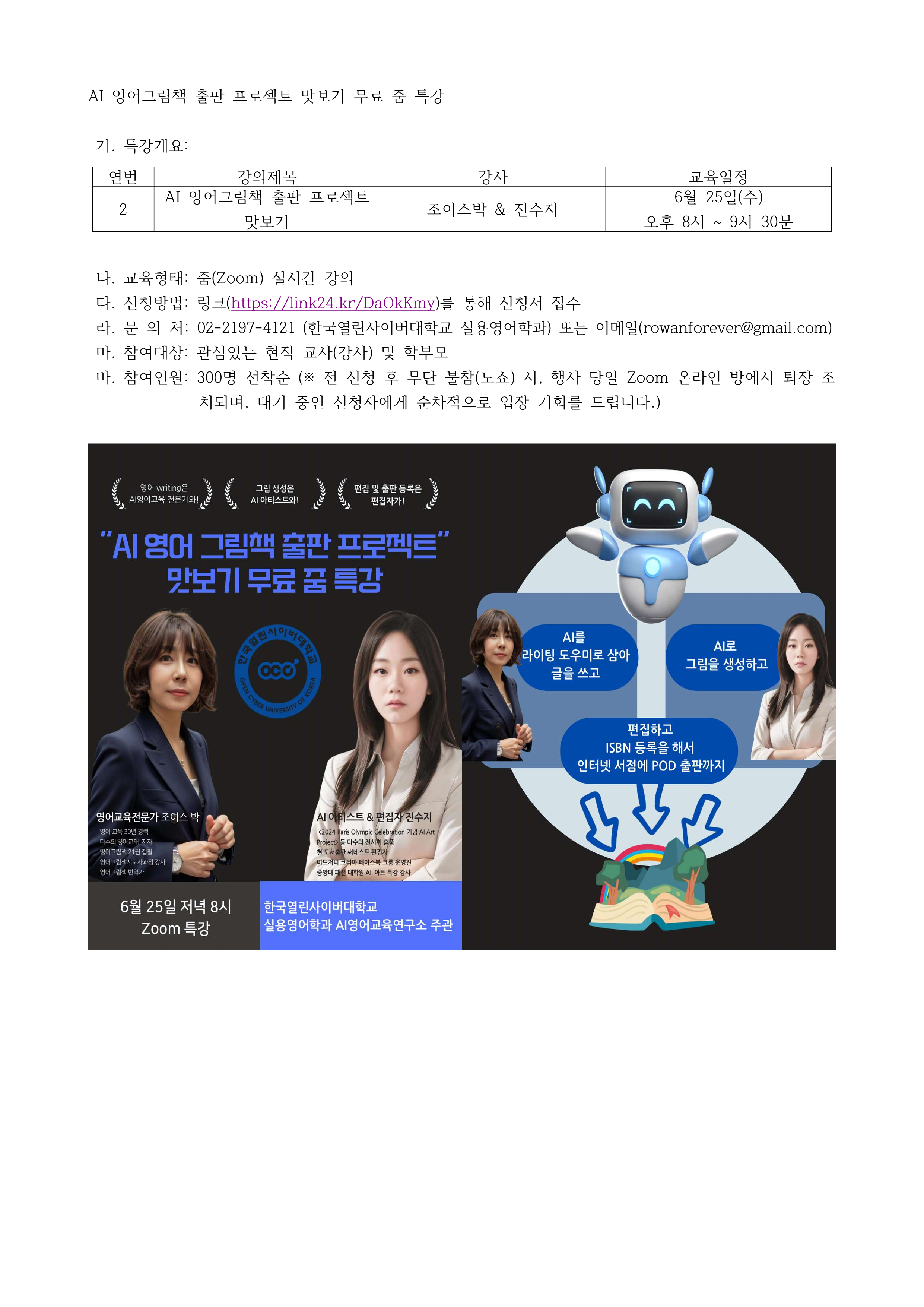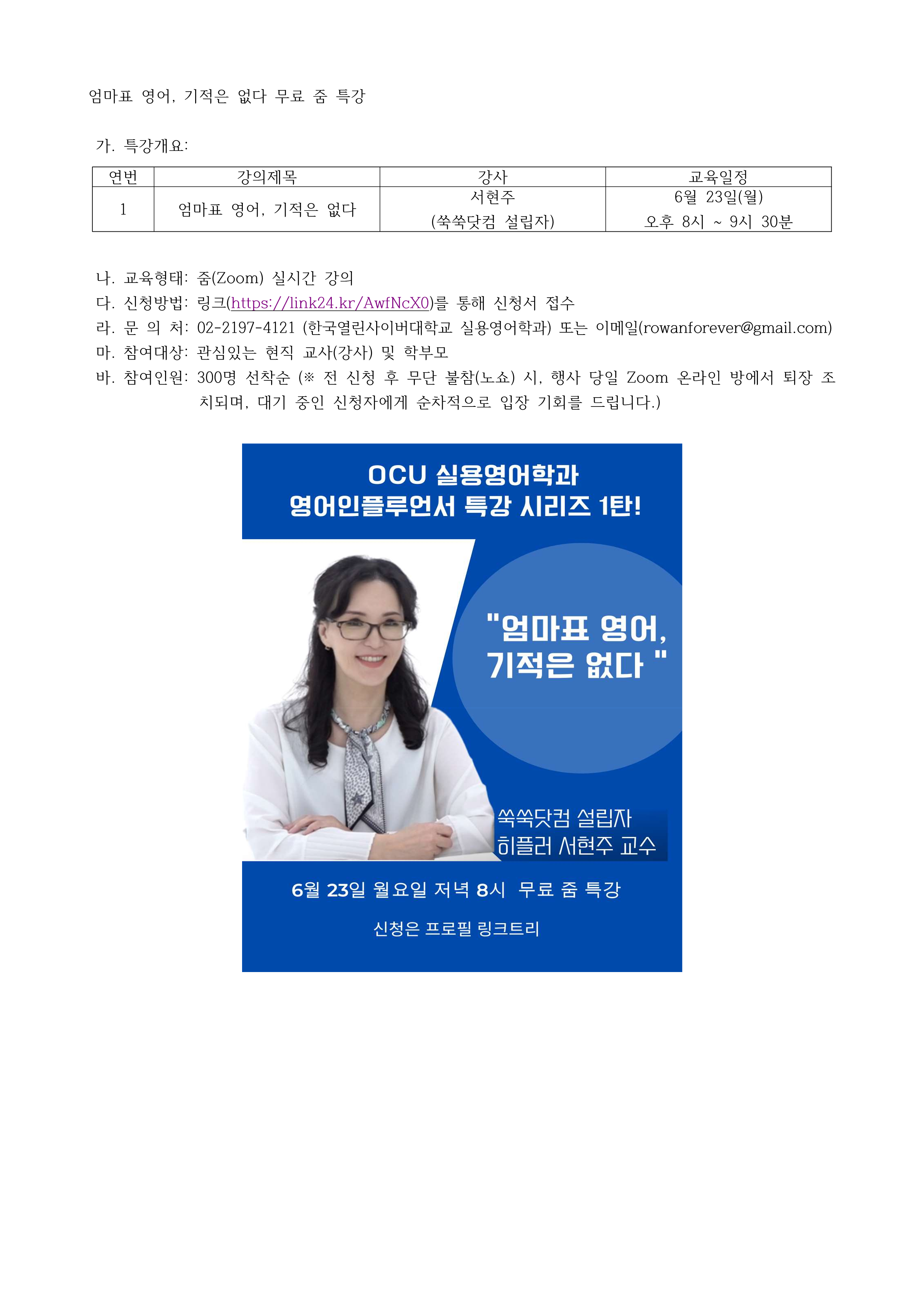 한국열린사이버대학교 평생교육원 무료 특강 안내